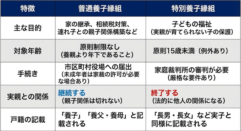 相続における養子縁組の影響を理解するためには、まず「普通養子縁組」と「特別養子縁組」の制度的な違いを整理する必要があります。